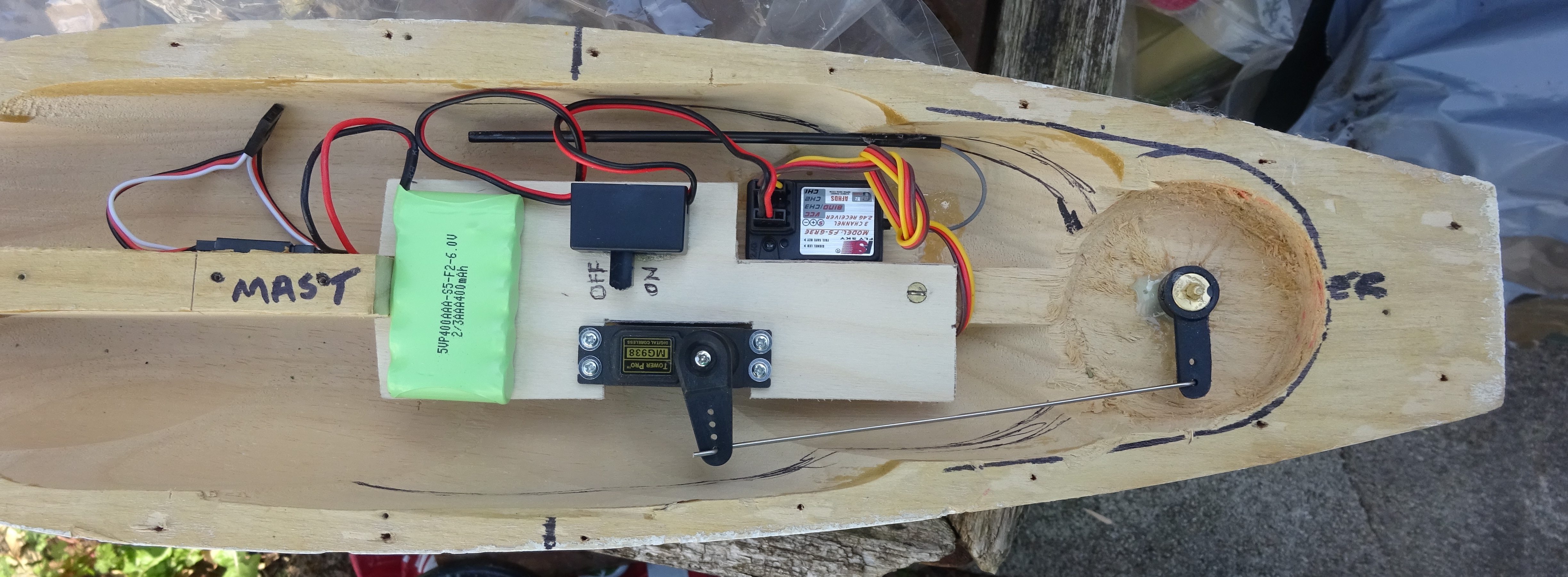 The servo setup will have to be tested before connecting the servo arm to the tiller arm. Always turn on the transmitter first, then turn the on/off switch to the ON position, if all is well then you should hear a short "Whizz" noise as the servo sets itself up to centralise itself, the receiver led should be showing a continuous red. Try to operate the servo with the steering on the transmitter. When happy, turn off. Always turn off the transmitter first, then turn the on/off switch to the OFF position, the led will extinguish.