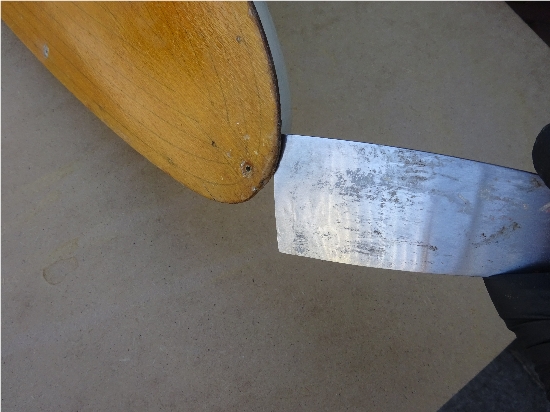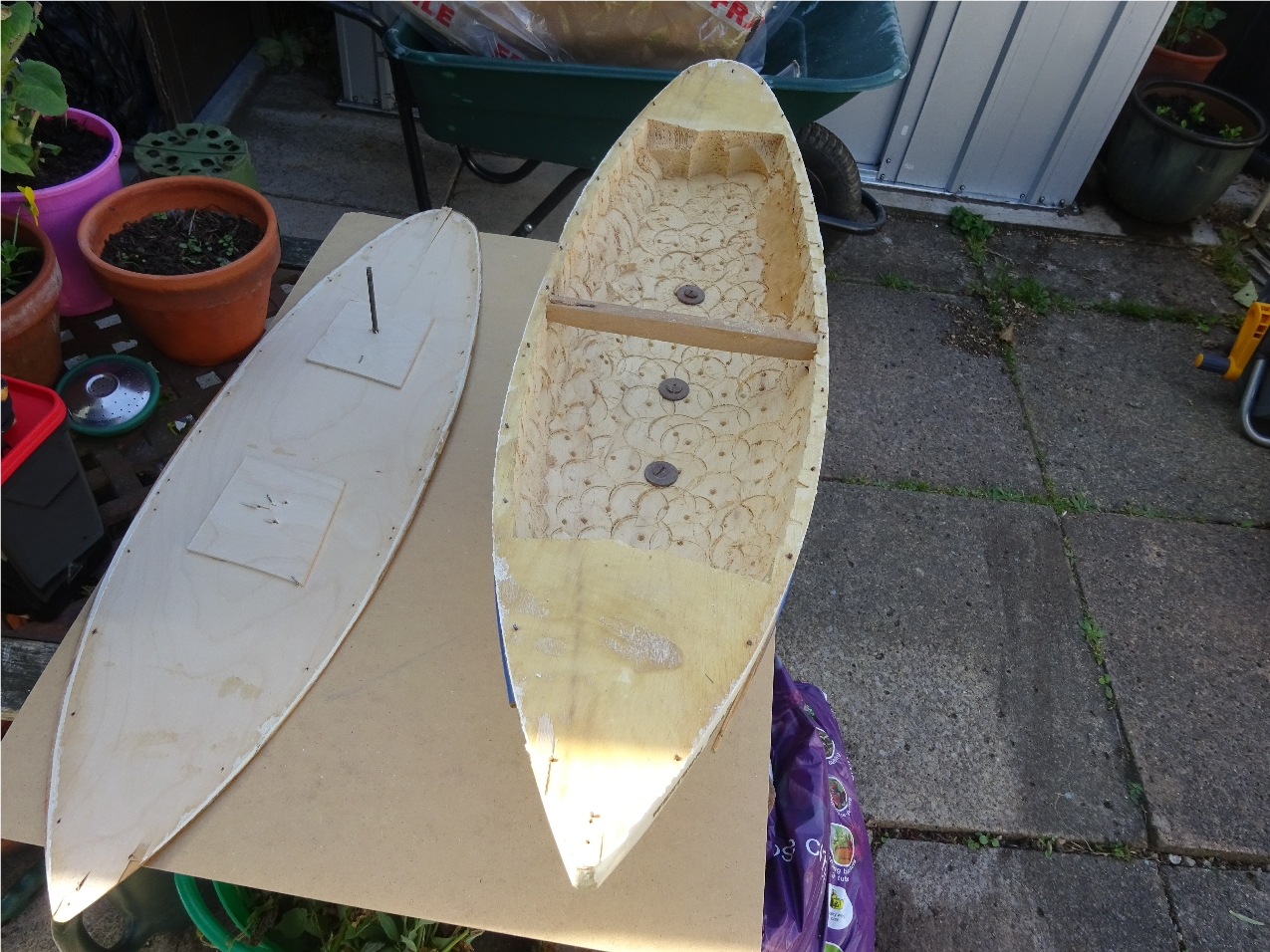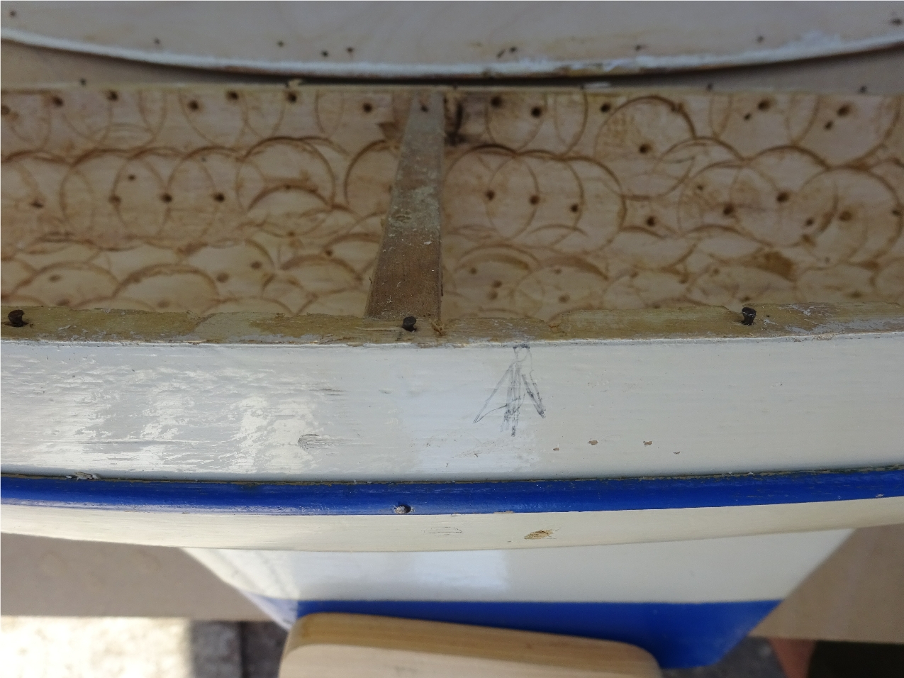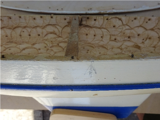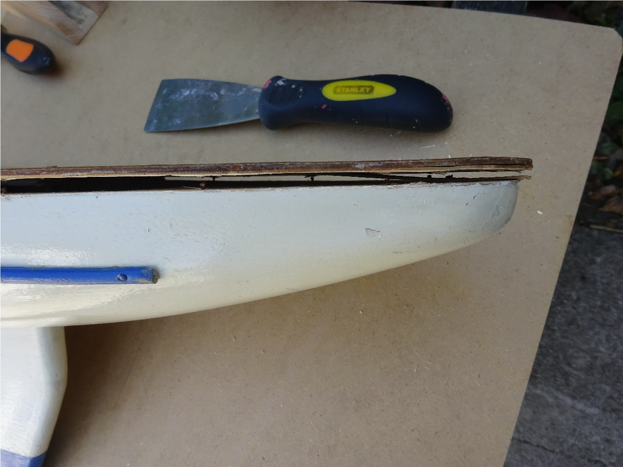 Next was to split the deck from the hull, starting at the stern using a flat paint scraper, I eased the deck away from the hull, the deck is secured in place by glue and panel pins. All the pins pulled through the decking to be left sticking out of the hull edge, these were removed easily with pliers. The deck was already damaged and de-laminating so it will only be used as a template to make a new replacement.