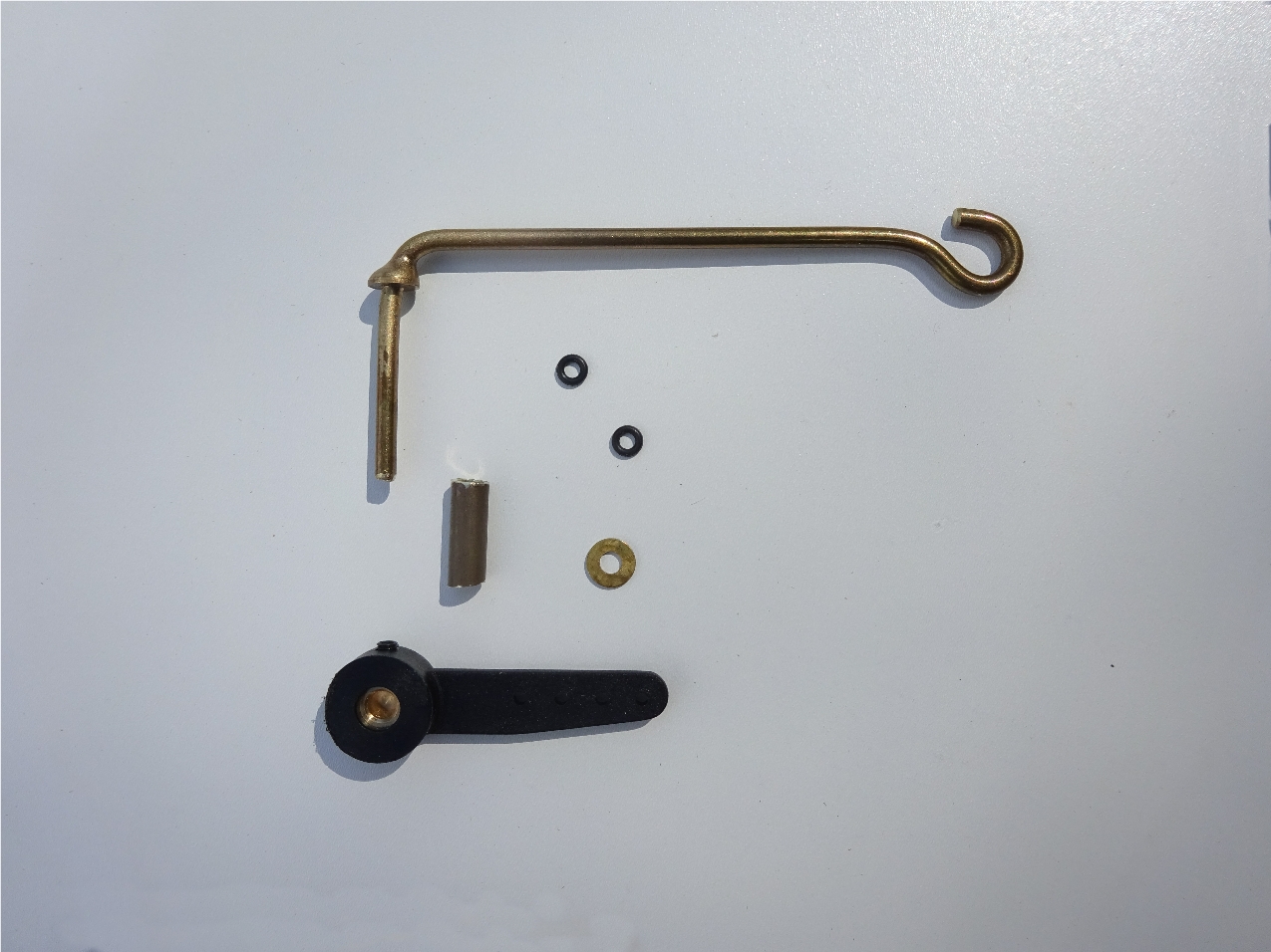 Re-made brass tiller arm, 2 brass washers (1 soldered) 2 nitride seals, a 17mm piece of rudder tube and a 3mm dia. tiller arm (Black).