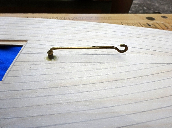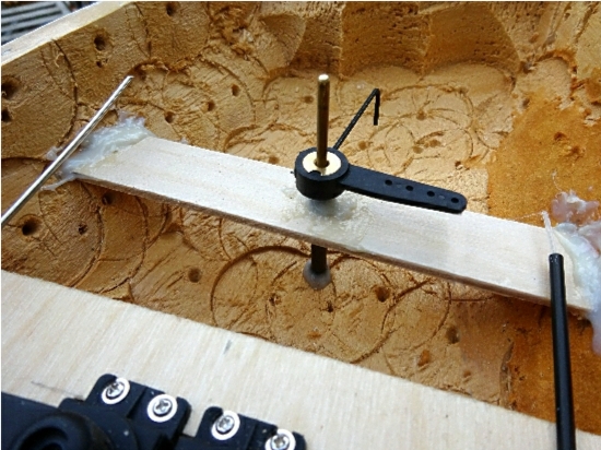Using the original deck for reference, a hole for the brass tube was drilled through the new deck about 13mm forward of the original position to accommodate the longer tiller arm so that it does not catch on the rear sheet-horse. The brass tube was then fixed into place by using Araldite resin glue and putting enough above the deck to make a capstan shape to stop it falling through the deck, making sure it was vertical. Position the tube to protude below the deck re-inforcing panel by 2mm. The deck was then left until the next day for the glue to cure.