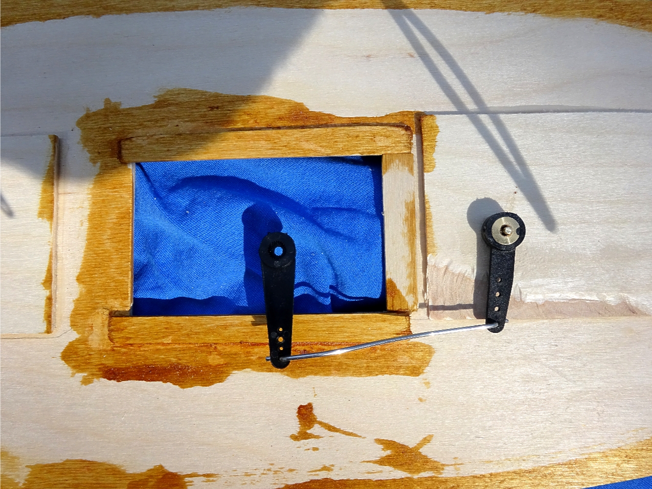 Starting with the rudder, position a servo arm on the left hand servo and note the distance to the rudder tiller arm, cut a couple of lengths of stainless wire allowing an extra 25mm, using pliers, bend a double 90 degree dogleg into one end of the stainless wire and at the noted length bend another dogleg, it may be a case of practice makes perfect but you will get a satisfactory fit then trim any excess length off the wire. The provided adjustment holes in the nylon arms may need widening slightly to take the wire, you can do this with a small drill bit to get a snug fit. Once happy, fit to the rudder arm first, then remove the servo arm, fit the wire and refit the servo arm. Any slight adjustments to the rudder position can be taken up on the transmitter trim adjustment. Make another wire of the same dimensions and try into position for the tiller arm, to test fit the deck in place and connect together, if the position is way out then make another wire allowing for the length adjustment. When happy with all of the fit, the servo screw for the rudder can be fitted, the tiller servo screw is fitted after the deck is in place. You can at this point apply a small amount of grease to the arms / wire joint for lubrication.