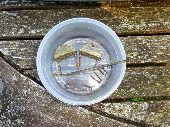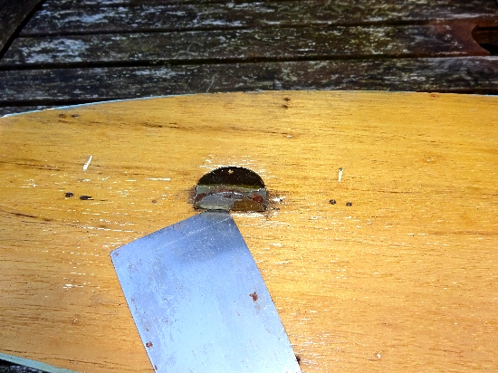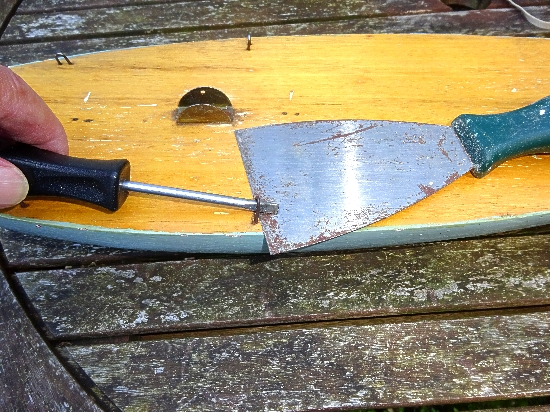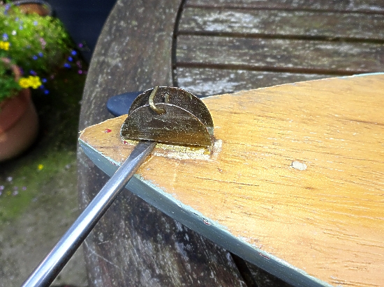 Using a scraper, insert the corner under the mast mount, try to lift it up at one end. It may not move so continue to use force even if the mount starts to bend inwards, any distortion can be straightened out later with pliers. In my case the mounts had been off before and were refitted with longer pins which needed excessive force to remove. Again do not worry if some surrounding wood comes out with the pin.