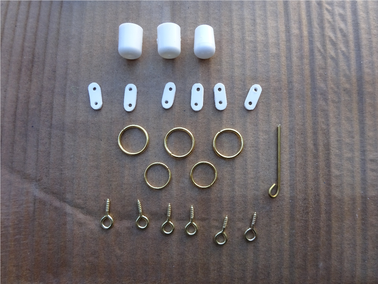 Here are the parts need for this restoration. 2 x 10mm and 1 x 8mm plastic ferrules, 6 x plastic bowsies, 3 large and 2 small brass rings, 6 x screw eyes and a piece brass wire for the top of mast rigging point.