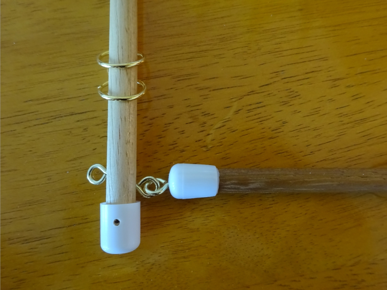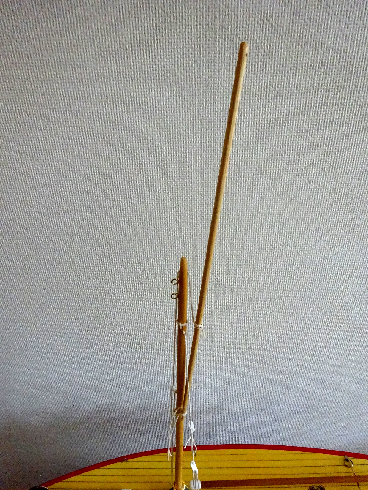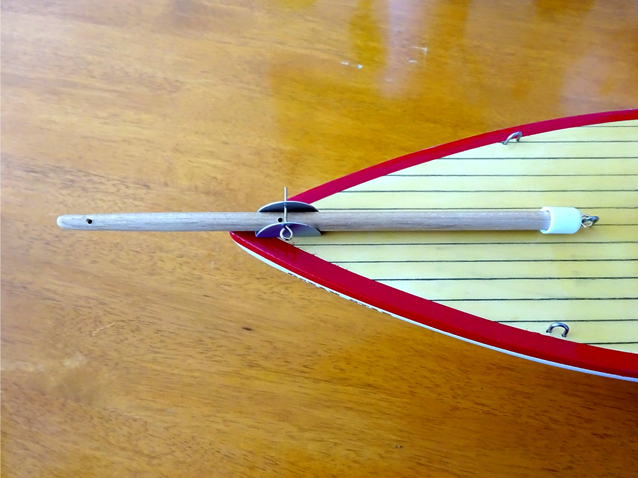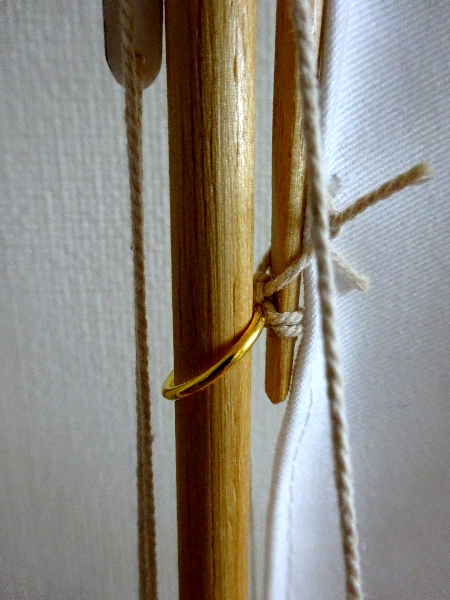Get the gaff spar and at the bottom with the flat side towards the mast, thread a cord through the drilled hole and knot around the gaff spar then tie to the top brass ring on the mast.