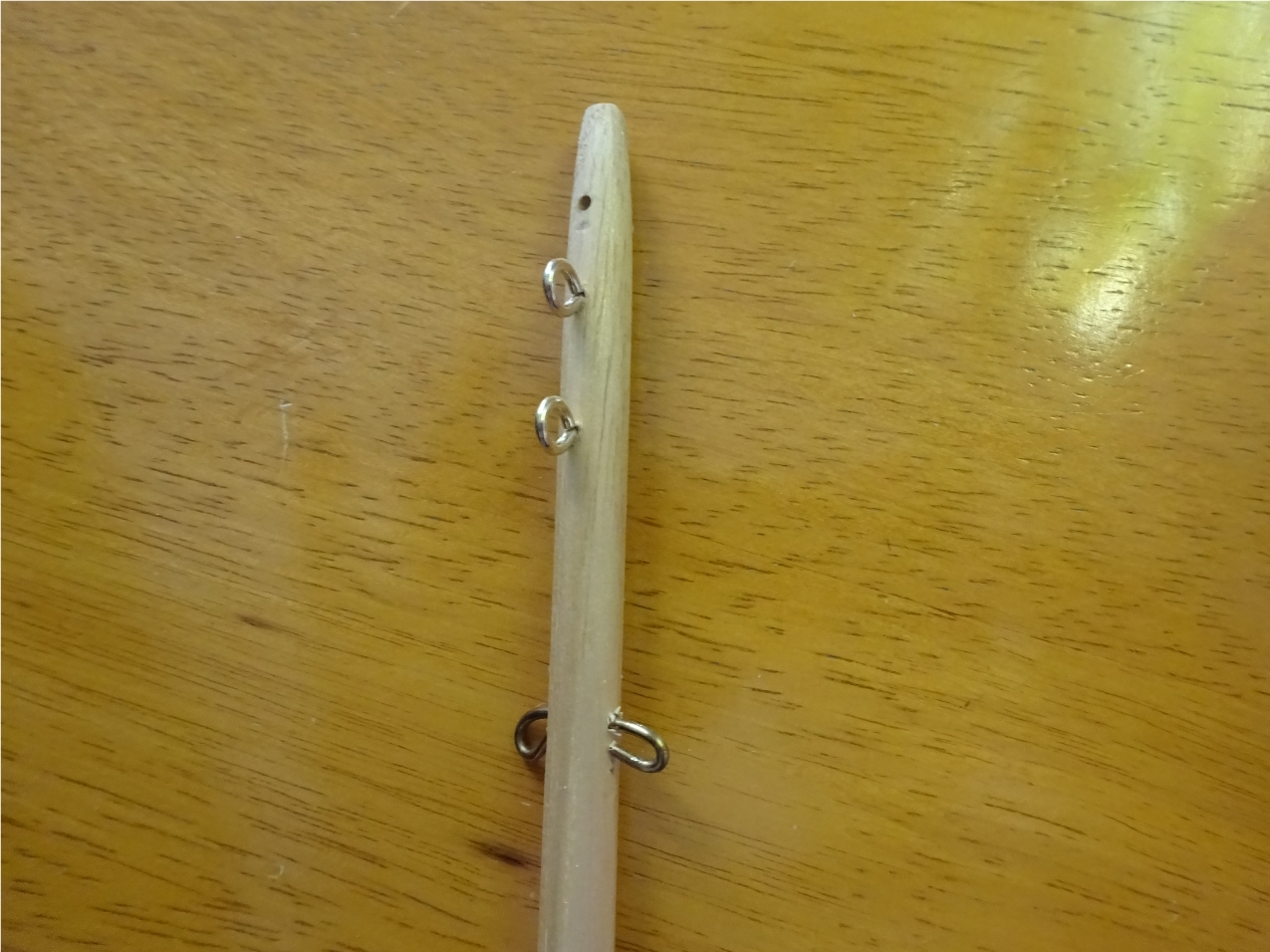 Drop two brass rings down the mast for securing the mainsail and anchoring the gaff spar. Fit two screw eyes and the cross piece brass wire to the top of the mast.