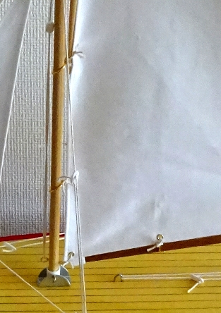 Now to the main sail, some models may have had small brass rings fitted through the eyelets to connect to the brass rings on the mast and boom but on this yacht I am using cord throughout.