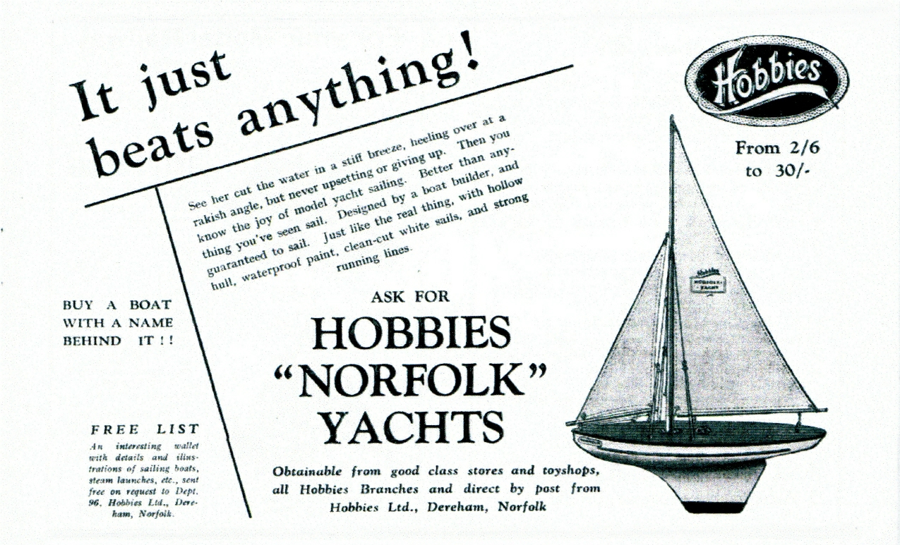 Another yacht that was made for another company was the "Hobbies" Norfolk yacht, there is evidence of Star Productions having the sail emblem stamps so more likely the whole yacht was produced, around 1931 or 1932. The yacht followed very closely the hull shape and style of the first series BR and SB yachts. Hobbies of Norfolk have replied but their old catalogues are in storage and cannot give any further details as yet.