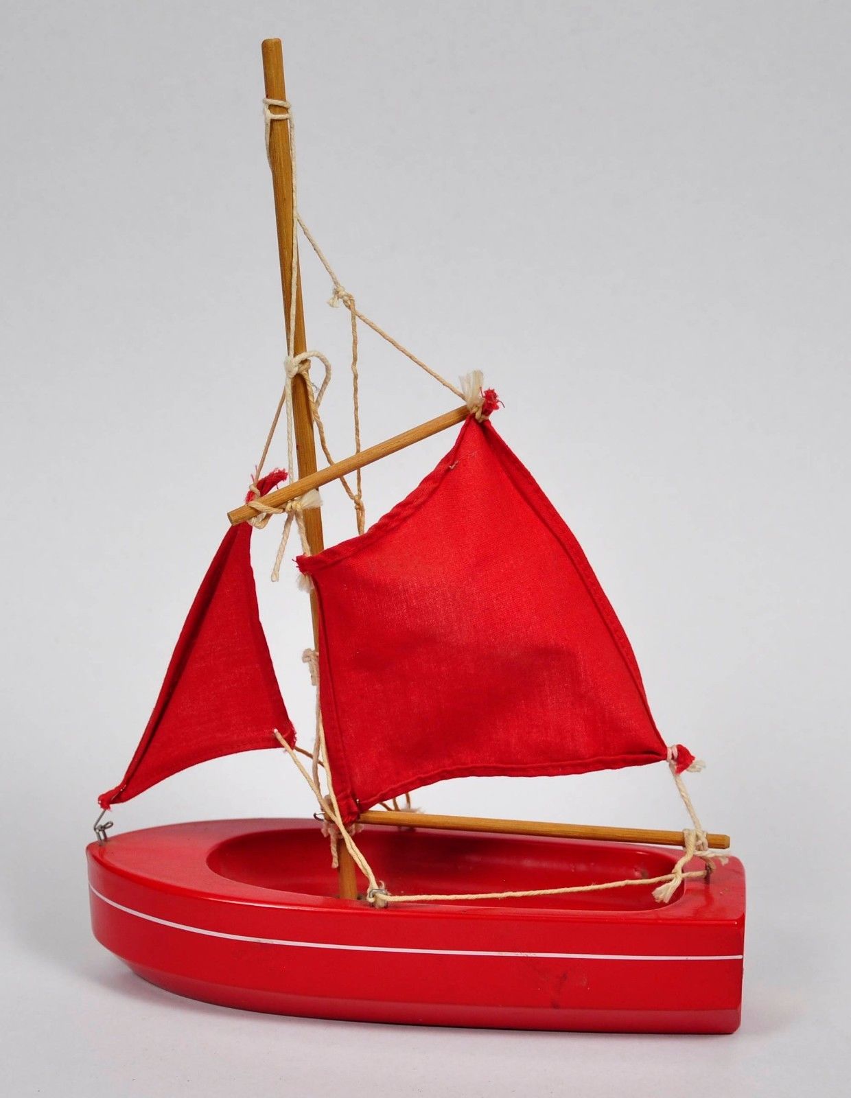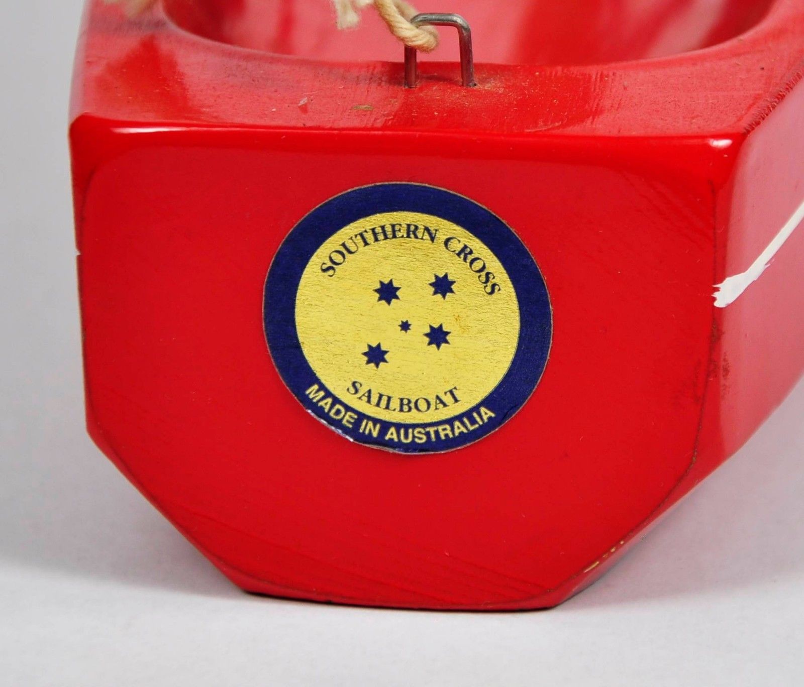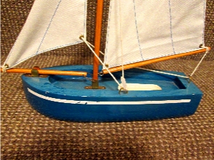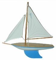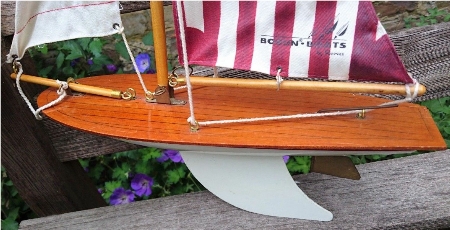 The Star Yacht Works supplied in small batches, basic unstamped yachts to other companies that were then re-badged, one of these being Nelson. Nothing is known about the company now but there is one 16 inch example in blue paint and a smaller green one that we have for comparison. The finish of the yacht is the same standard of that of the Britannia with a good quality deck logo transfer.
