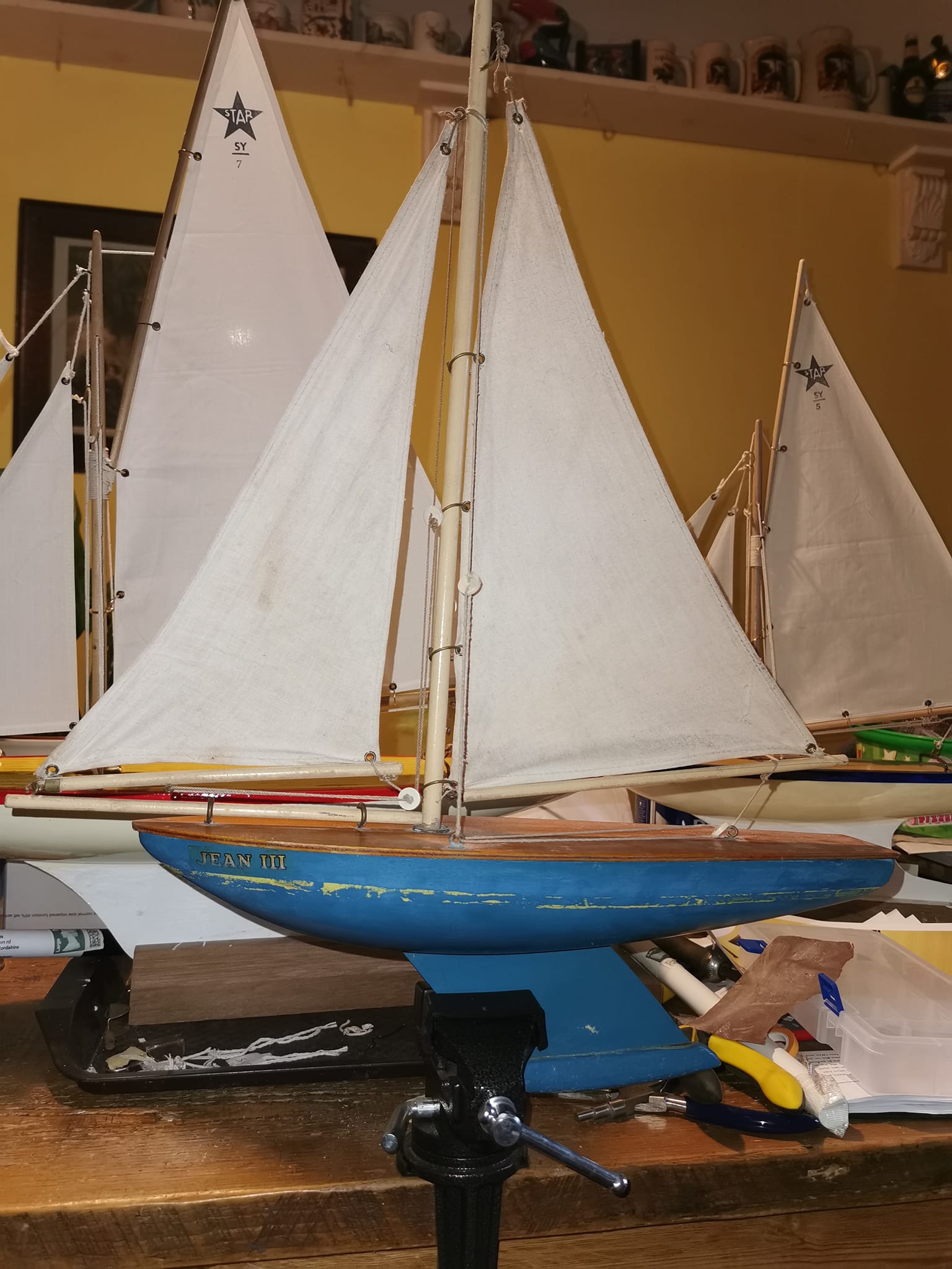 One of these was the Britannia yacht which was basically an in-between size SY series. Made in the 1960s to 1970s, these yachts were manufactured specifically for Woolworth stores. Painted in plain colours such as French or Mediterranean blue or red and with the lining being simply scraped through to the undercoat. Fitted in a 2 sail design, on the mainsail, instead of the familiar Star emblem there was an oval emblem with the wording "Guaranteed to sail", "Built in England" and hidden in the design a couple of tell-tale small 5 point stars. The Britannia yachts utilised the same mast mounts and deck furniture as their Star equivalents and sail just as well.