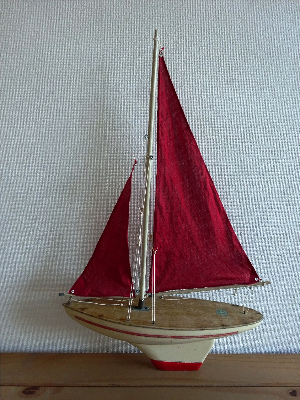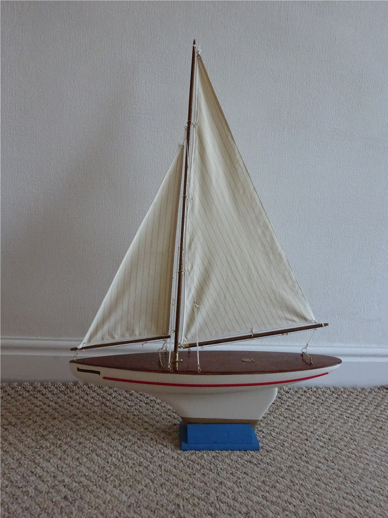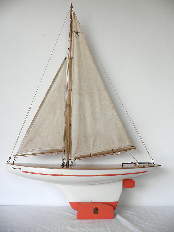 First year of production, 1932 SB/1, 16" hull with white masts and red sails, paper roundel deck badge. Early 1933 SB/4 with varnished masts, pinstriped sails, brass deck badge and scroll bow names. (Pre-wooden rudder version.) |
