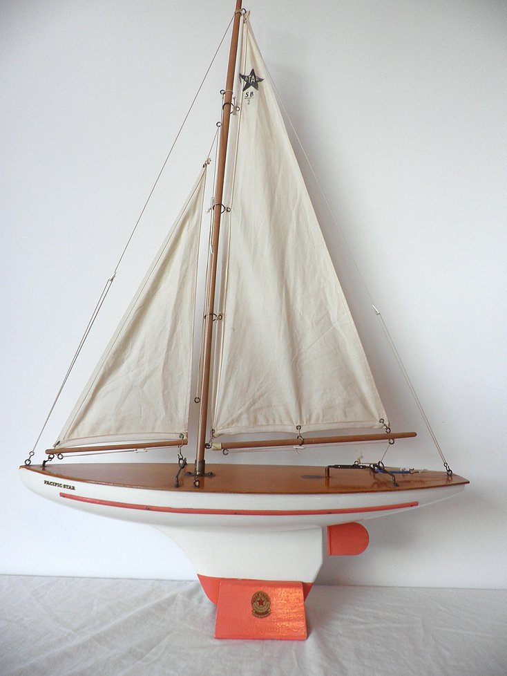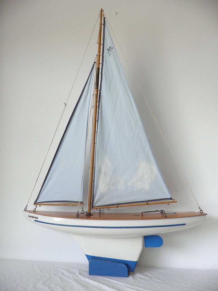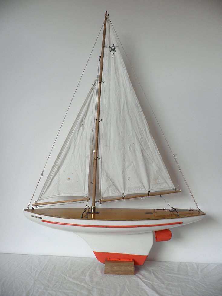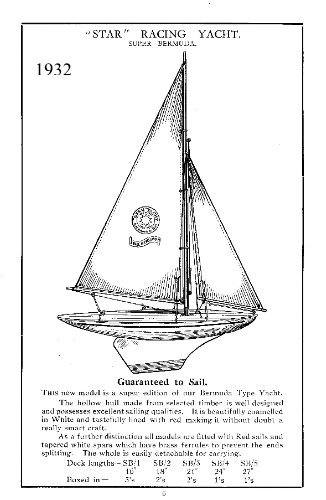 The Star Super Bermuda range launched in 1932 and was available in five models SB/1 16", SB/2 18", SB/3 21", SB/4 24" & SB/5 27". An "Up market" addition to the Star range with hollow hulls, plank lined decking, brass fittings and the familiar Bermuda rigged sails. For the first year of production, the yachts used the same hull and weighted wooden keel as the BR Series. The pre-war hulls were painted an off white, cream colour with wooden rubbing strips painted red along the hull sides. The masts for 1932 and 1933 on the SB series were unusual as they were painted white with brass ferrules. The sails in the first year were made from red material, this changed in the next year to a red pin-striped material and in later years to waxed cambric. 1930s versions, when fitted, had a red oval sail emblem denoting the series model which wasn't hardy and soon disappeared, changing after the war to the more familiar five pointed STAR emblem. 1933 - 1939 models were fitted with brass deck badges. Early red sails had an all-round double hem, the leading and bottom edges of the pin-striped and waxed cambric sails were taped, the remaining edge, double hemmed.